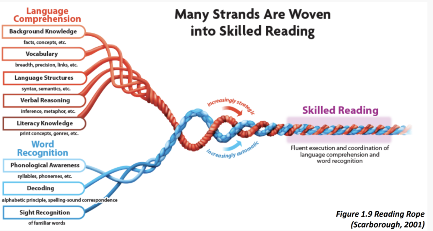 Scarborough’s Reading Rope illustrates how the different strands of reading skills weave together over time to create fluent, automatic reading comprehension. It breaks the process into two main strands:
